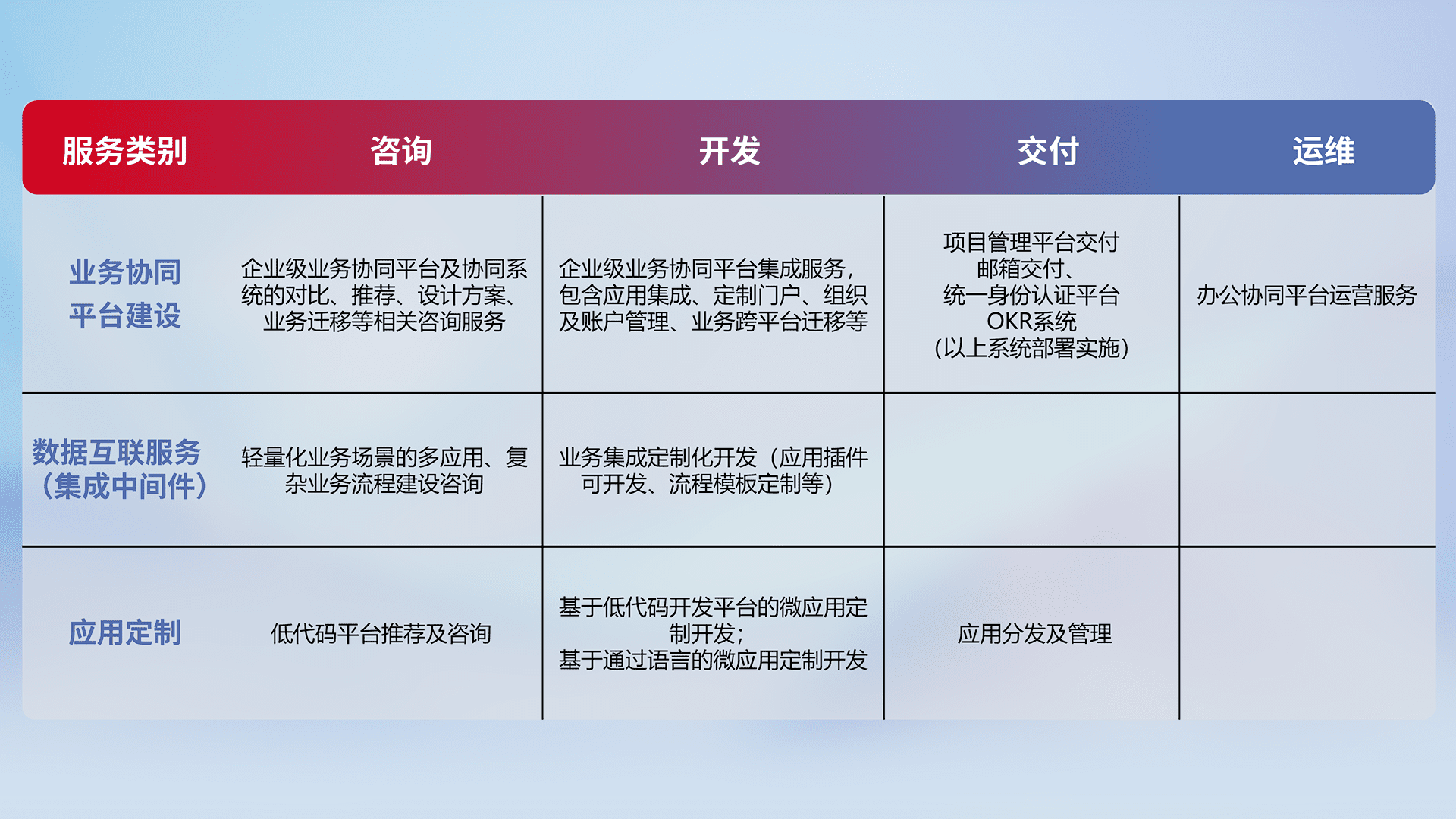针对钉钉、、、企微、、、IDaas等平台级产品提供产品的规划、、、、方案、、交付、、、定制化开发等服务,,,实现如统一协同办公、、、智能客户服务、、、、混合会议管理、、、、智能数据查询、、、等业务场景,,,,实现数字化转型。。。。